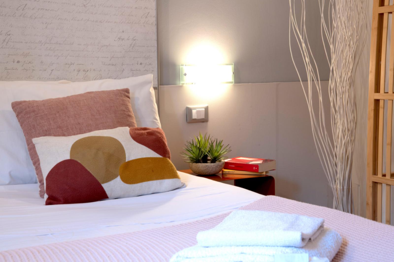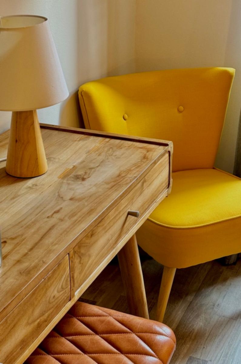A Stylish Room Suite é um quarto privado elegante e luminoso, equipado com casa de banho privada e mobiliário moderno. A cama de casal é acompanhada por almofadas decorativas macias e roupa de cama de qualidade. A zona de guarda-roupa aberta em madeira e o assento estofado aos pés da cama oferecem praticidade e estilo. Um canto com secretária e poltrona amarela cria um espaço perfeito para ler ou trabalhar. O quarto faz parte de um apartamento maior, também disponível para aluguer completo.